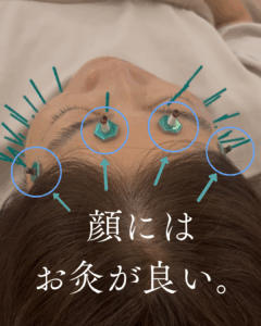 →顔のお灸は副交感神経を優位にしやすく、自律神経のケアをしてくれる。手足の経穴にもお灸をすることで睡眠の質やホルモンバランスを整え、結果的に、肌荒れ、くすみ、目のクマ等の改善に関与している。